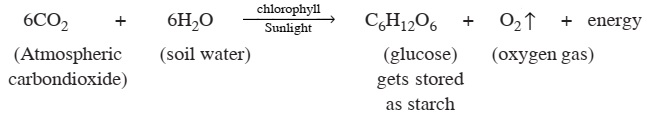 Plants prepare their own food in the presence of sunlight hence they are autotrophs. Solar energy is trapped by green plants to produce organic food such as sugar (glucose) with the help of atmospheric carbondioxide (CO2) and water (H2O) from soil. This process is called Photosynthesis in which water is absorbed by roots and CO2 diffuses into leaves through stomata.